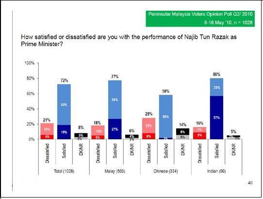 Menurut soal selidik yang dijalankan oleh Merdeka Center, Perdana Menteri Najib AbdulRazak bangkit dari jurang populariti 34% (Mac 2009) dan melonjak kepada catatan rekod tertinggi, iaitu pada 6-16 Mei 2010. Apa yang menarik, komuniti India yang "memberontak" dalam PRU ke-12, kini muncul sebagai golongan kaum yang paling berpuas hati terhadap prestasi Najib, iaitu 80%, sedikit lebih tinggi daripada responden Melayu. Responden berketurunan Cina, sebagaimana yang dicerminkan dalam PRK, kekal sebagai golongan kaum yang paling skeptikal dan pesimis ketika menilai Najib dan kerajaannya, malah semasa meramalkan ekonomi masa depan.